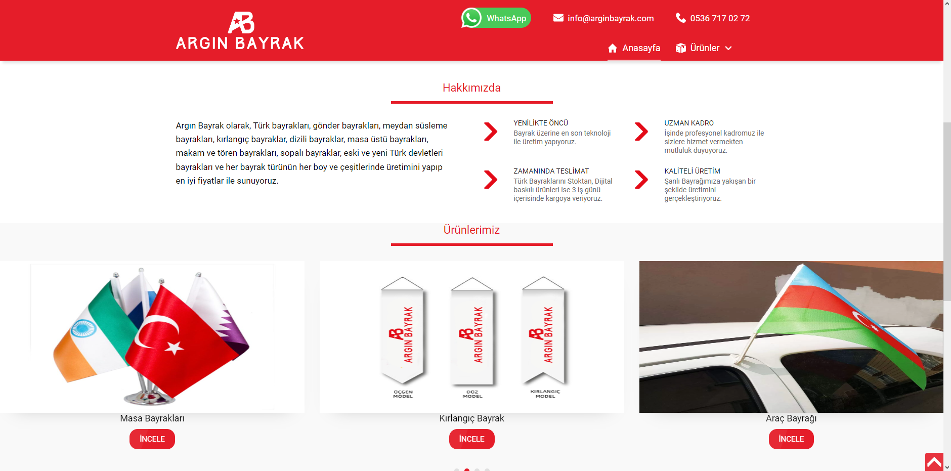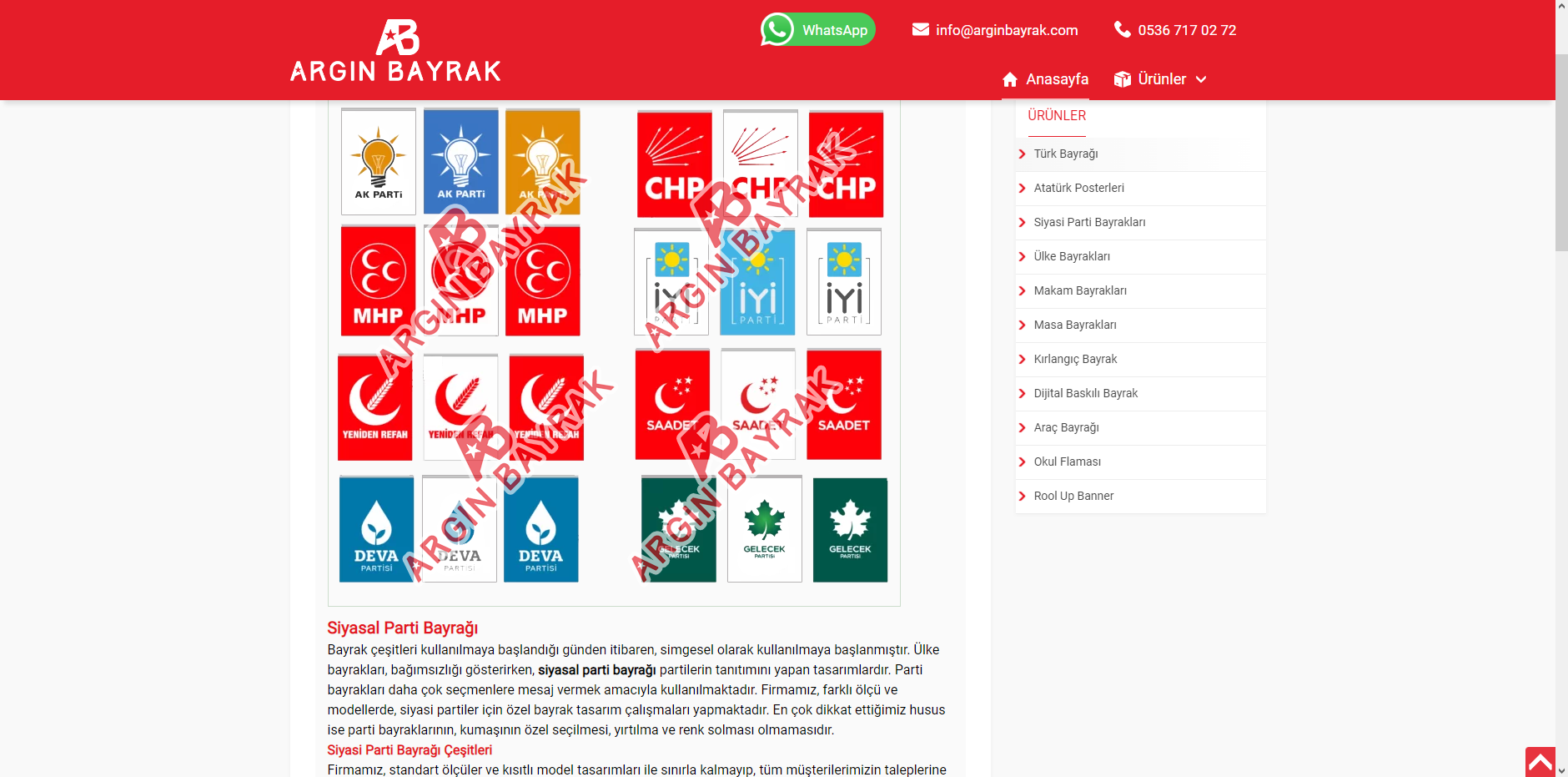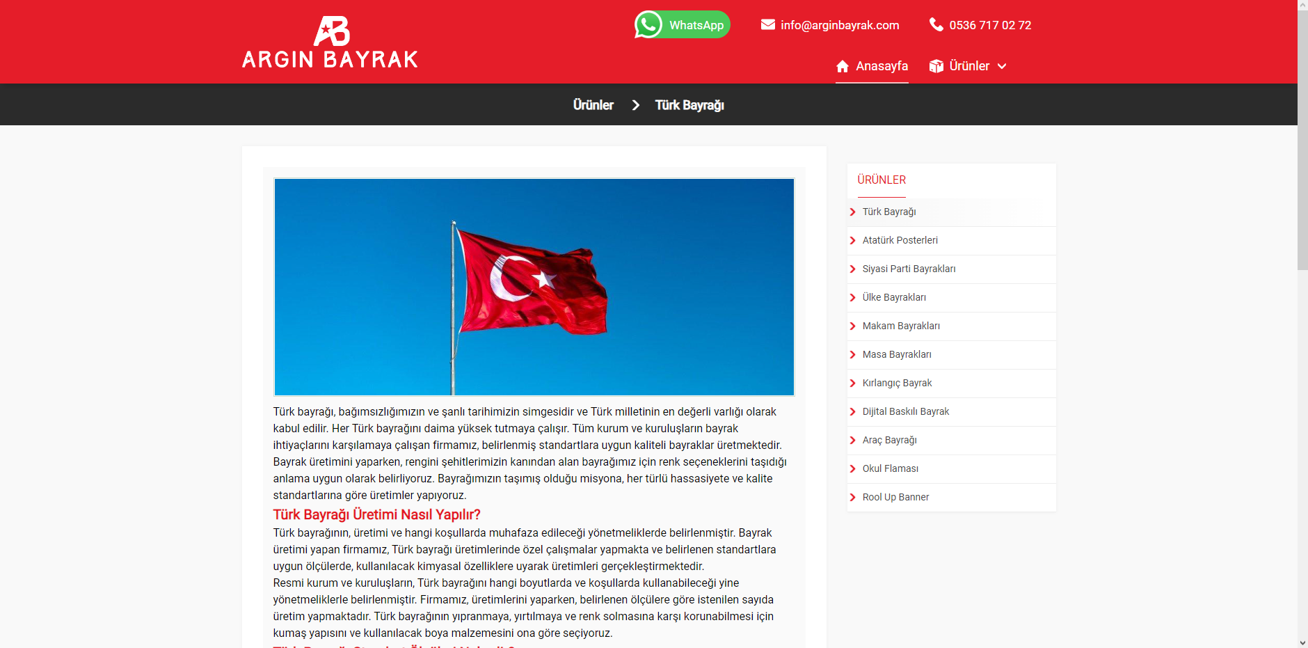 Argın Bayrak olarak, Türk bayrakları, gönder bayrakları, meydan süsleme bayrakları, kırlangıç bayraklar, dizili bayraklar, masa üstü bayrakları, makam ve tören bayrakları, sopalı bayraklar, eski ve yeni Türk devletleri bayrakları ve her bayrak türünün her boy ve çeşitlerinde üretimini yapıp en iyi fiyatlar ile sunuyoruz.